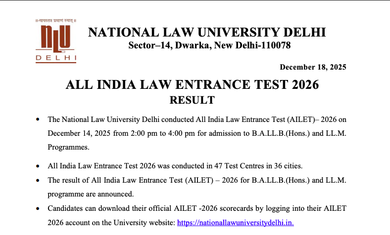 AILET Exam Update: Today, on 18th December 2025, the National Law University (NLU) Delhi has officially released the All India Law Entrance Test, AILET 2026 result.
