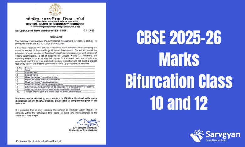 CBSE Board Exam Update: The Central Board of Higher Secondary Education has released a circular regarding the subject-wise marks Bifurcation of Class X/XII, examination 2025-26.