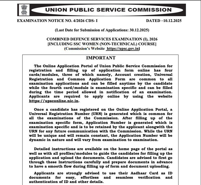 CDS Exam Update: The Union Public Service Commission has finally released official details for the CDS 2026 session 1.