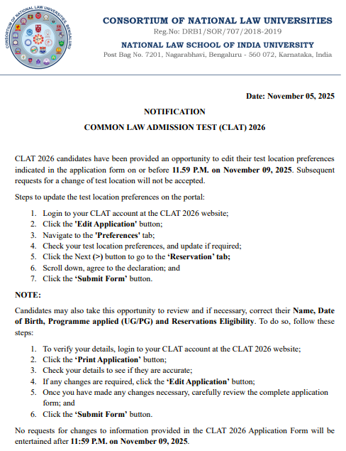 Direct Link To Edit CLAT 2026 Application Form: Click Here