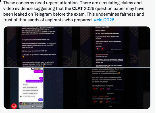 In a recent update for the examination, after the CLAT 2026 exam, some posts and videos on Telegram suggested that the question paper might have been leaked before the test. These claims are not verified, but they have made many students anxious.