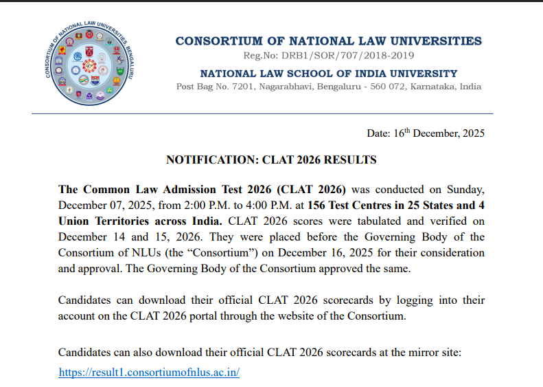 CLAT Exam Update: The Consortium of NLUs has activated the link to check and download the CLAT 2026 result on 16th December 2025.