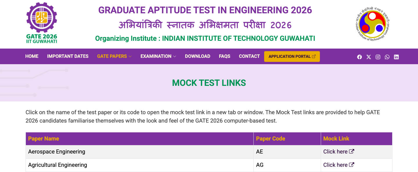 The GATE mock tests are free and are available for all the registered candidates. The link to access the GATE 2026 paper wise mock test is activated at gate2026.iitg.ac.in