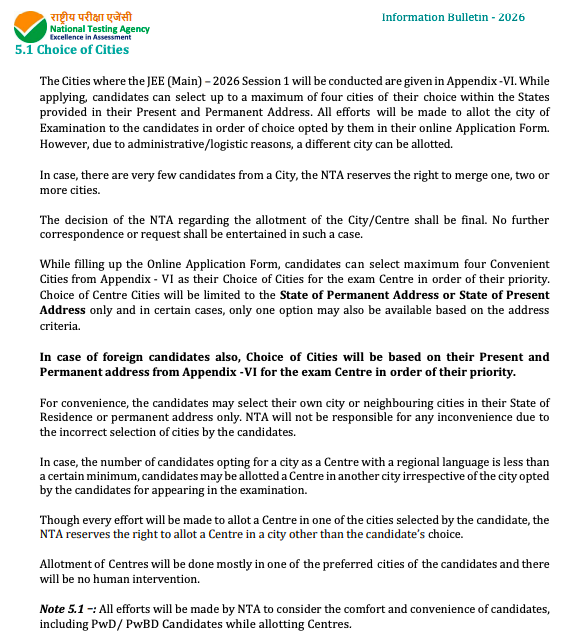 All the details regarding the number of cities and the choice of city preference are available on the JEE Main 2026 information bulletin. It is released at jeemain.nta.nic.in