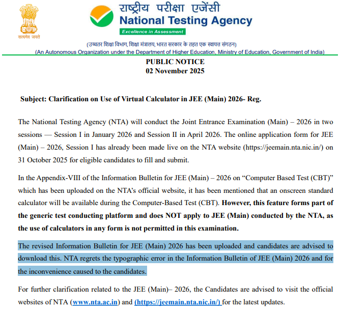 Now, on 02nd November, the NTA has released a notice informing candidates about the typos and errors in the JEE Main 2026 information bulletin PDF regarding the virtual calculator.