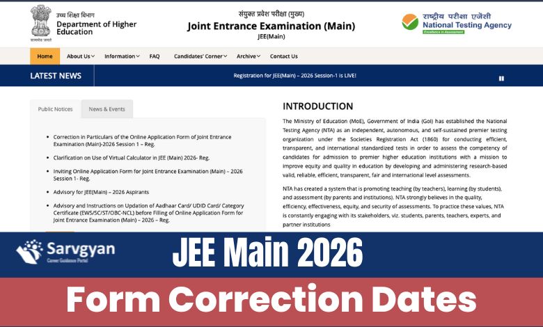 JEE Main Exam Update: The National Testing Agency has released a notice on 20th November 2025 regarding corrections to the particulars in application form for Joint Entrance Examination (Main) – 2026 Session 1.