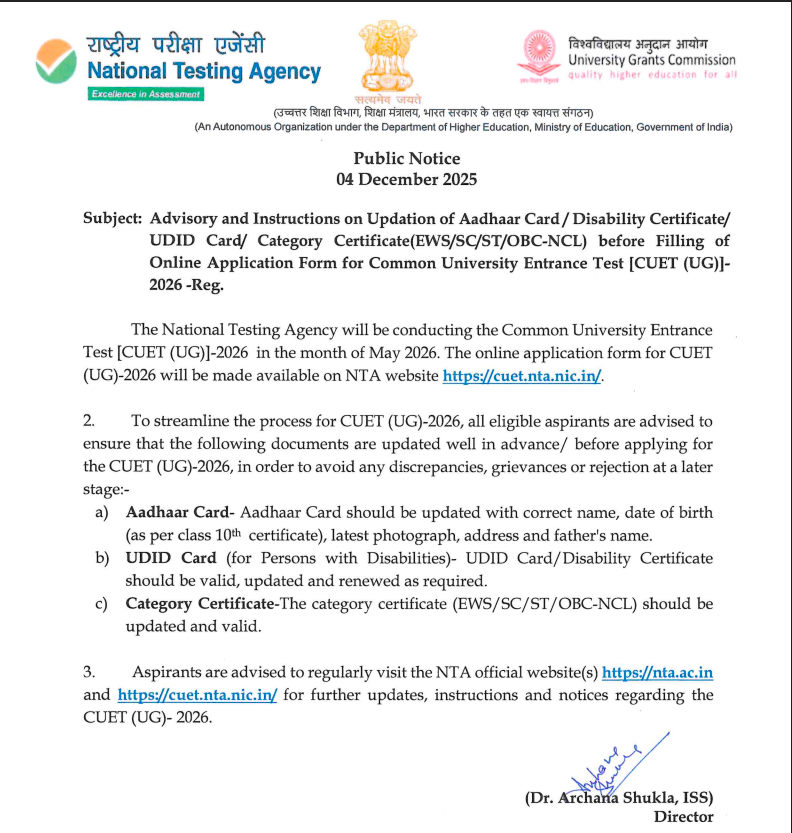 For this session to avoid errors or rejection during CUET UG 2026 registration, candidates are advised to update their Aadhaar, UDID/Disability Certificate, and EWS/SC/ST/OBC-NCL category certificate well in advance. Ensure all details are correct, valid, and renewed before filling the application form.