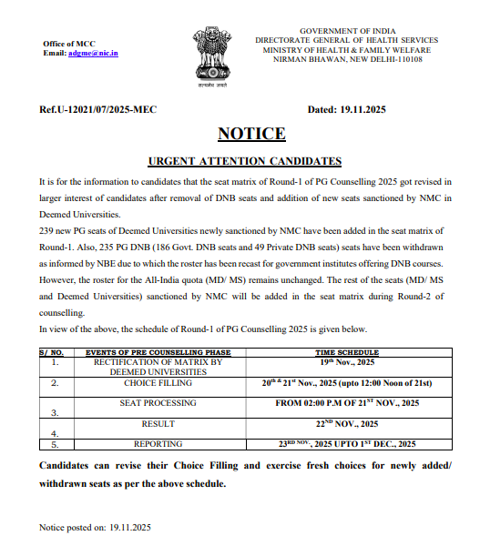NEET PG Counselling Update: MCC, in a recent has extended the Choice Filling of NEET PG 2025 Round-1 Counselling again till 21st November 2025.